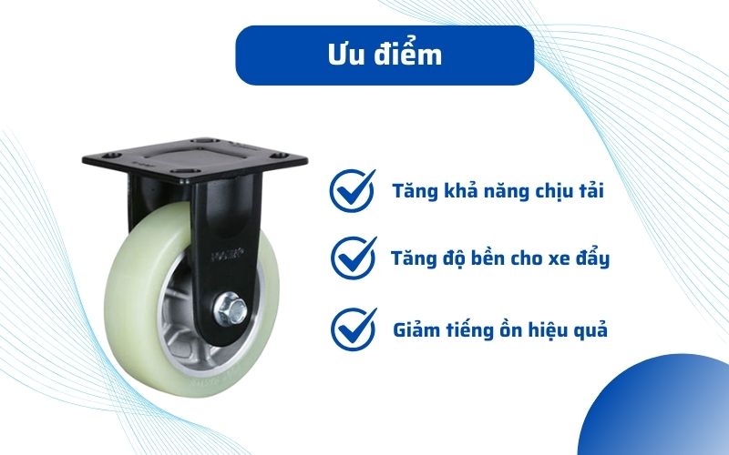 Đặc biệt, một số dòng bánh xe đẩy chịu lực còn được gia cố thêm lõi thép chắc chắn, giúp nâng cao tải trọng và tuổi thọ, rất thích hợp cho môi trường công nghiệp nặng.